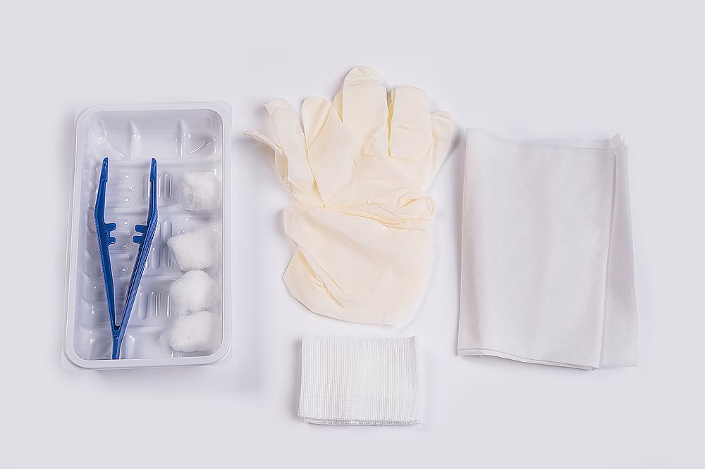 本品 A 型由標(biāo)準(zhǔn)配置一次性使用鑷子和選用配置一次性使用包布,醫(yī)用棉簽、醫(yī)用棉球、脫脂紗布?jí)K、一次性使用治療巾、檢查手套、一次性使用聚乙烯檢查手套、碘伏棉球、酒精棉球、一次性使用手術(shù)刀片、酒精棉簽、酒精面片、透氣創(chuàng)口貼、一次性使用無(wú)菌橡膠外科手套、醫(yī)用薄膜手術(shù)巾、一次性醫(yī)用中單、碘伏棉簽組成;B 型由標(biāo)準(zhǔn)配置托盤、非吸收性外科縫線和選用配置無(wú)菌應(yīng)用縫合針,一次性醫(yī)用孔巾、一次性使用包布,醫(yī)用棉簽、醫(yī)用棉球、脫脂紗布?jí)K、一次性使用治療巾、檢查手套、一次性使用聚乙烯檢查手套、碘伏棉球、酒精棉球、剪刀,一次性使用鑷子、無(wú)菌塑柄手術(shù)刀、次性使用手術(shù)刀片、酒精棉簽、酒精面片、透氣創(chuàng)口貼、一次性使用無(wú)菌橡膠外科手套、醫(yī)用薄膜手術(shù)巾、一次性醫(yī)用中單、碘伏棉簽組成